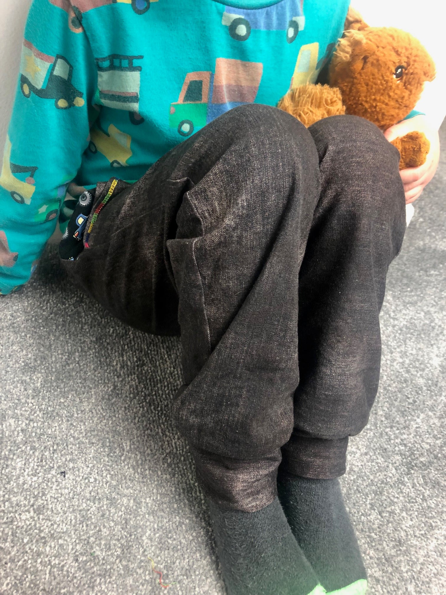 Amazing loose fit joggers with an elasticated waistband and pockets! Everyone loves pockets. A nice, loose and comfy fit. The pockets can be the same as then main fabric or a contrasting colour. I used a denim look jersey in the photo and then added monster truck fabric pockets at my son's request.